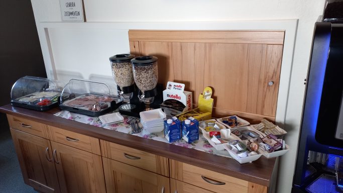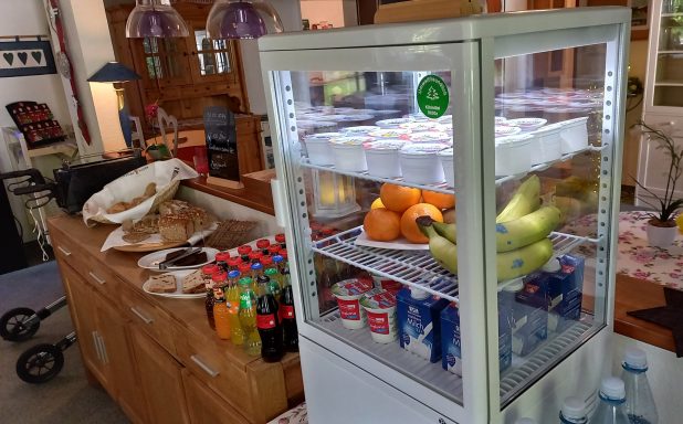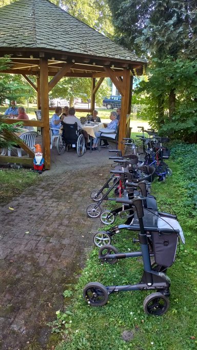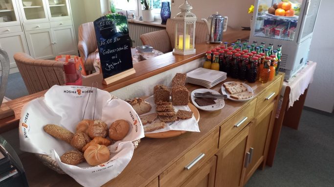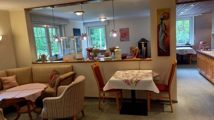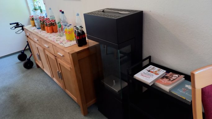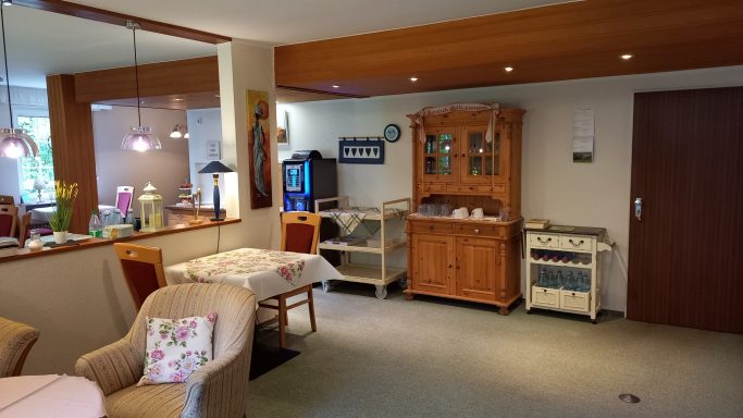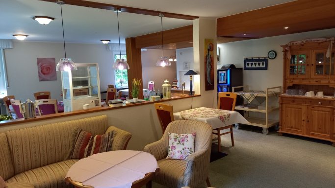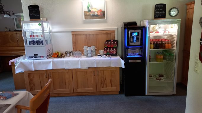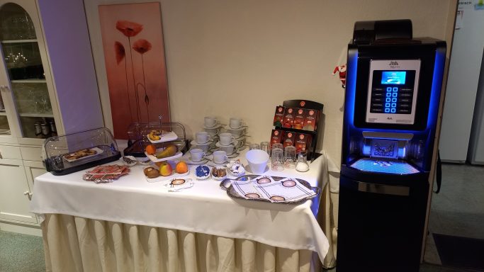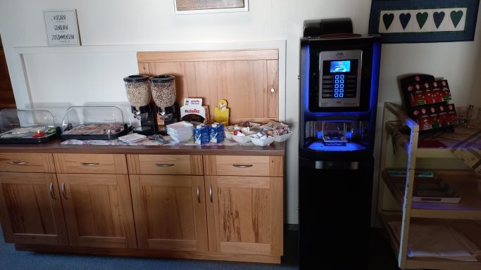 Zur Kaffeezeit versorgt sich jeder in unserer kleinen Cafeteria und trifft sich gerne im Außen- oder Innenbereich.