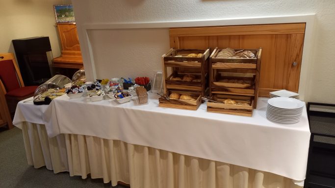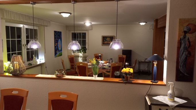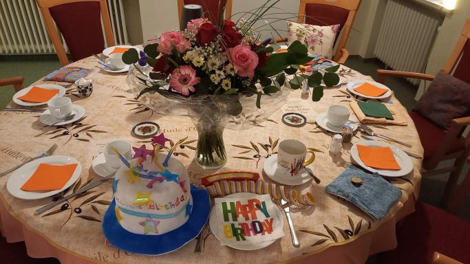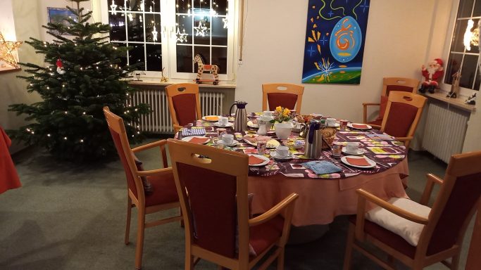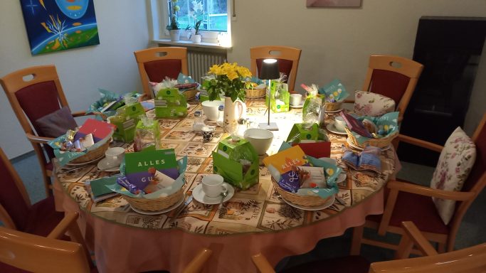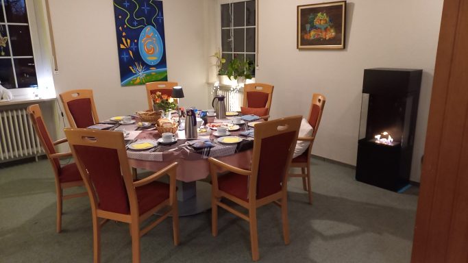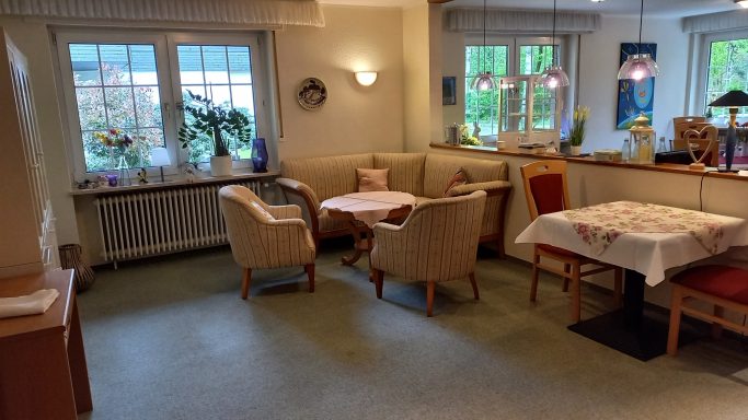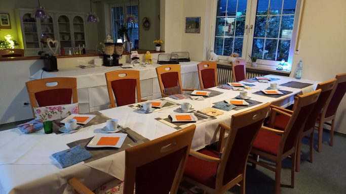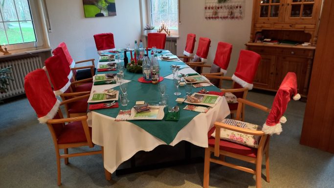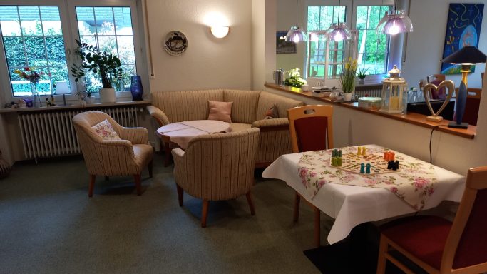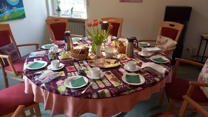 Zu den Hauptmahlzeiten treffen sich unsere Bewohner im Gemeinschaftsraum an einer langen Tafel.
