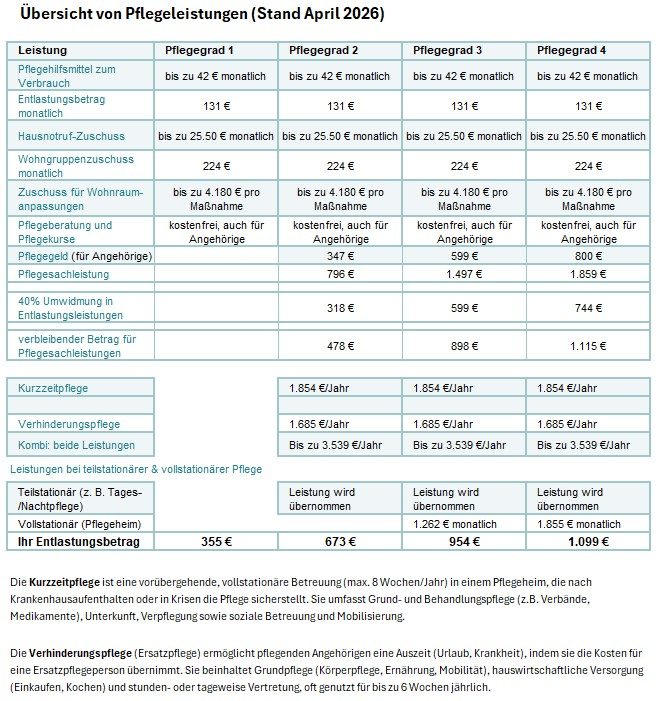 Die Pflegekassen unterstützen Personen mit einem Pflegegrad. Ein Großteil dieser Pflegekassenleistungen ist in untenstehender Tabelle aufgeführt.